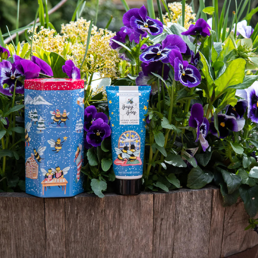 A cheering snowman and buzzing bumblebees tin containing Thyme & Honey hand cream. There may be honey in the name, but the fragrance is honey-free ensuring this hand cream with shea butter is 100% vegan.