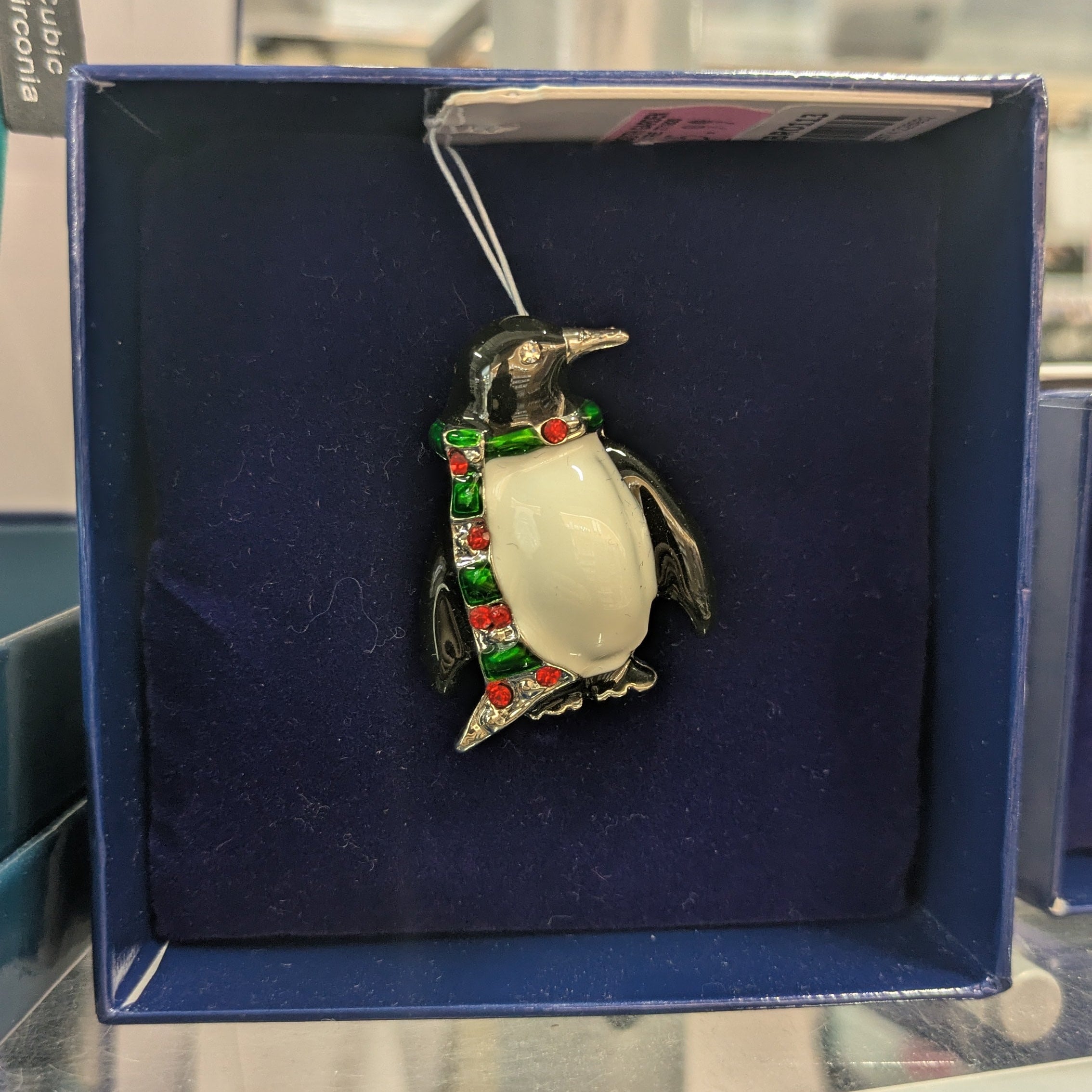 Waddle into the festive season with this charming rhodium penguin brooch, complete with a cosy scarf! Perfect for adding a touch of winter whimsy to your coat, jumper, or bag. This delightful little fellow brings holiday cheer and a playful smile to any outfit. Whether you're dressing up for seasonal celebrations or simply spreading festive joy, this adorable penguin companion is sure to be a conversation starter. A must-have accessory for penguin lovers and festive fashion enthusiasts alike.