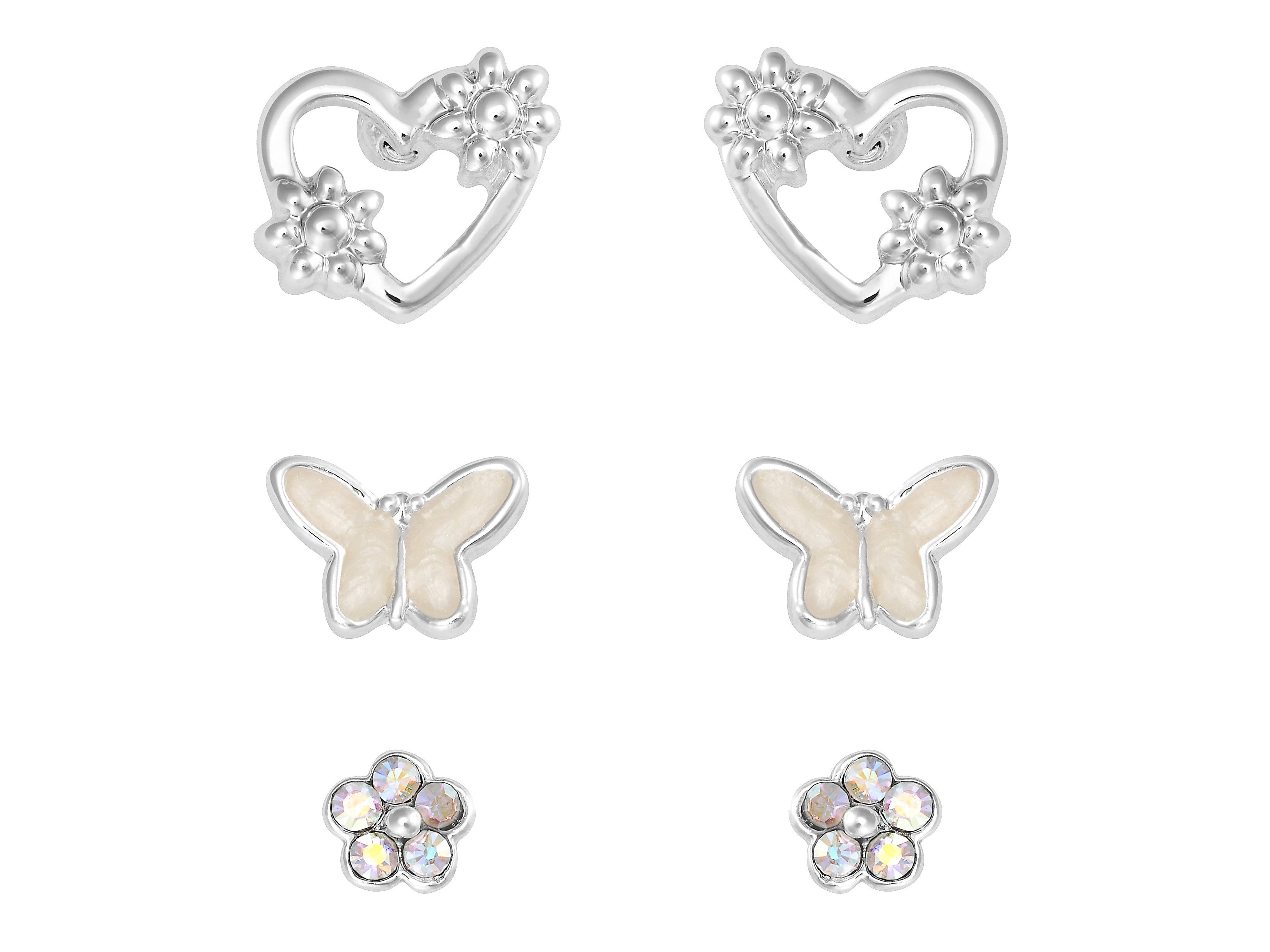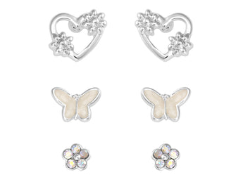Add a touch of whimsy to your style with this playful set of three silver earrings featuring delicate flowers, a charming white butterfly, and a sweet heart. Perfect for mixing and matching, these lightweight pieces brighten any outfit and express your fun, feminine side effortlessly.