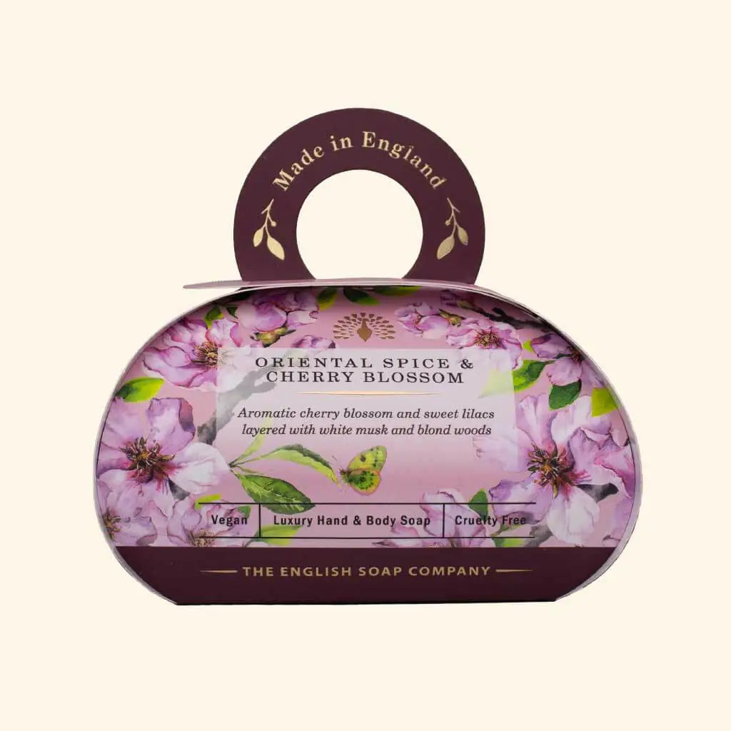 Experience luxury self-care with this Signature Oriental Spice and Cherry Blossom Gift Soap. Generously fragranced and expertly crafted from pure vegetable oils and enriched with shea butter, this vegan-friendly soap produces a rich, silky lather that scents and nourishes your skin. Presented in fully recyclable packaging with no plastic waste and adorned with charming illustrations, our eco-friendly soaps are the perfect gift or indulgent treat for yourself.