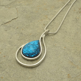 In a popular mid blue, the resin of this pendant is backed with aluminium foil, giving it texture and light catching qualities. The pendant measures 5.5cm high by 3cm wide and is hung on a 41cm snake chain with 8cm extender.
