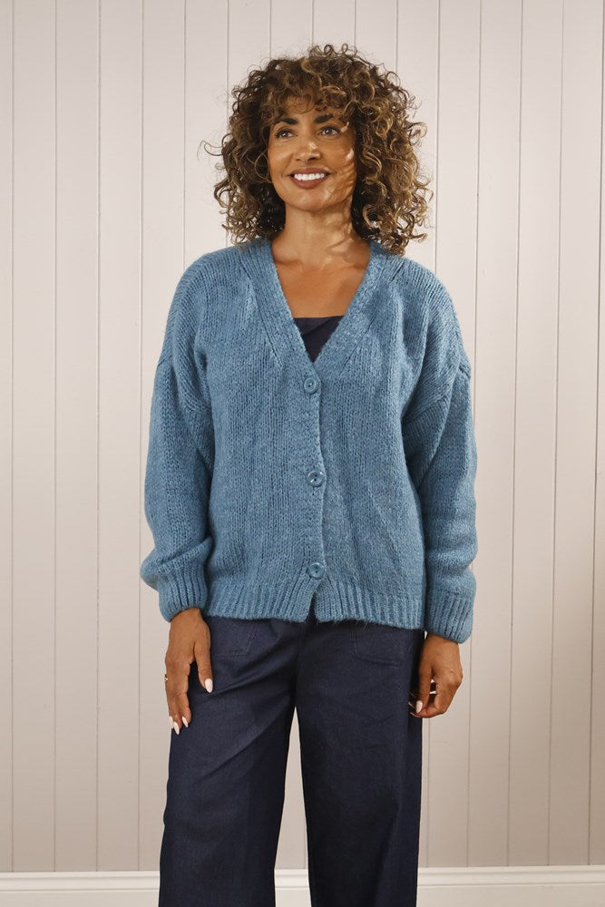 Wrap yourself in cosy comfort with this chunky knit cardigan in a gorgeous teal shade. The button-front design makes layering effortless, whether you're heading out for a casual stroll or settling in for a relaxed evening at home. Perfect for adding warmth and a pop of colour to your autumn and winter wardrobe. The substantial knit texture brings that satisfying, tactile appeal that makes you want to reach for it again and again. A timeless piece that pairs beautifully with everything from jeans to dresses.