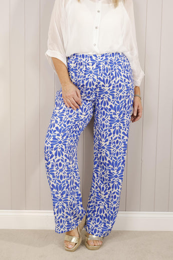 Introducing our newest addition, the Flower Burst Trouser in vibrant royal blue. Perfect for adding a pop of colour to your wardrobe, this playful piece is adorned with a unique flower print that is sure to make a statement. Don't be afraid to stand out and bloom!