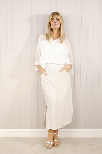 Stay stylish and functional with our Pocket Split Side Skirt! The beige color and pocket design add a touch of versatility to your everyday look. Now you can easily carry your essentials without sacrificing fashion. Perfect for those looking for a practical yet chic option.