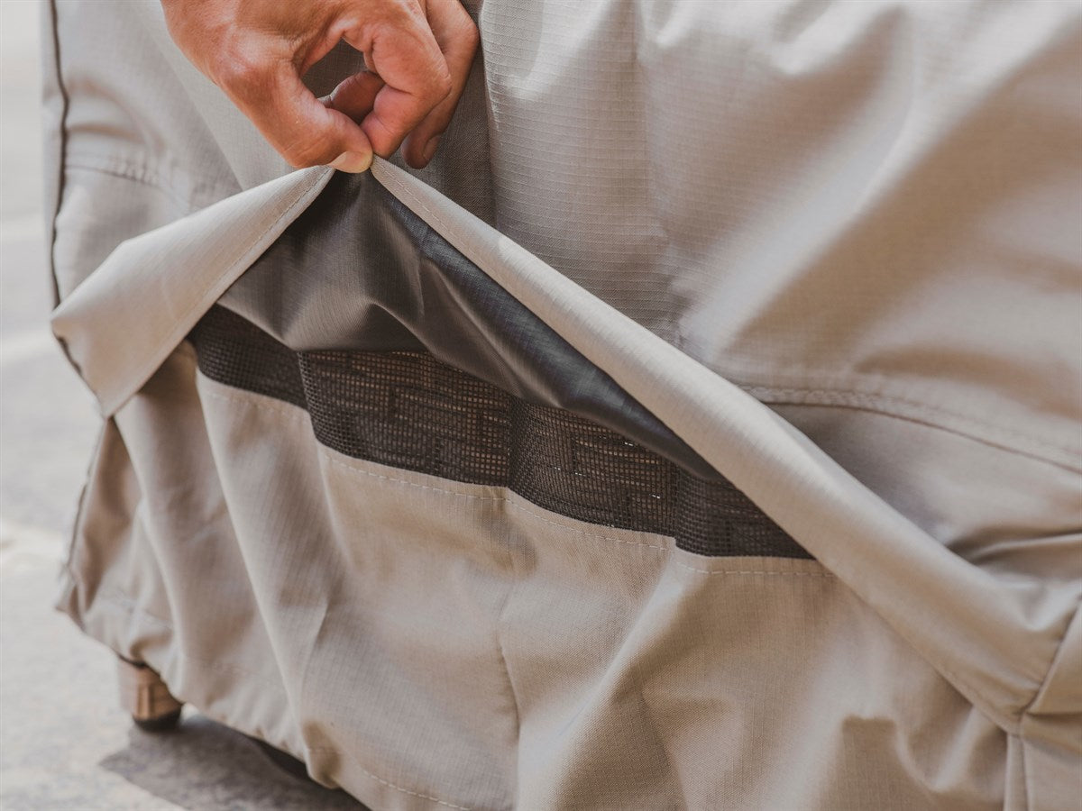 Protect your aluminium recliner furniture set year-round with our durable, high-performance covers in a neutral khaki shade. Made from ripstop 300 denier polyester, they offer strength, colourfastness, and long-lasting protection. A water-resistant, breathable backing, UV50+ protection, sealed seams, and strong fastenings provide reliable all-weather defence. Discreet vents helps reduce condensation and maintain airflow. Easy to fit, clean, and store - with a handy drawstring bag included - our covers provide dependable protection with minimal effort.