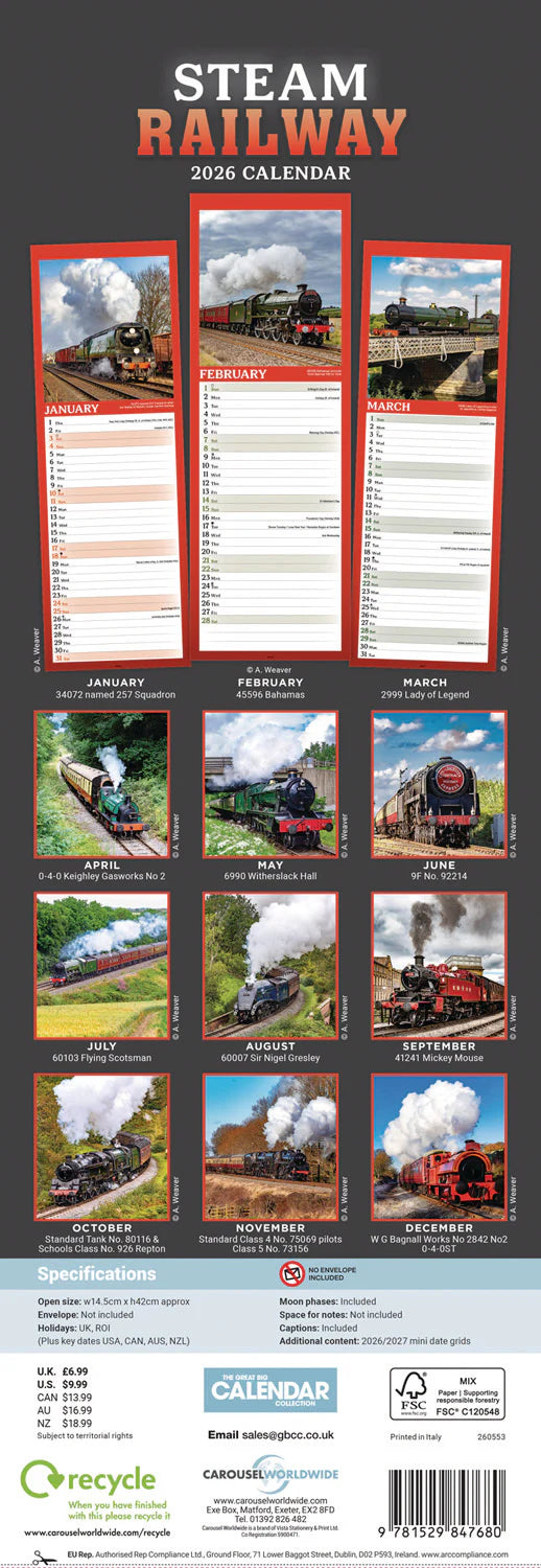 Step aboard the Steam Railway Slim Calendar 2026 and enjoy a year-long journey through vintage locomotives that steam their way into your heart. Slim and sleek, it fits perfectly in any space without crowding, while keeping you on track with every chug and whistle. Perfect for train enthusiasts who love a bit of nostalgia with their planning!