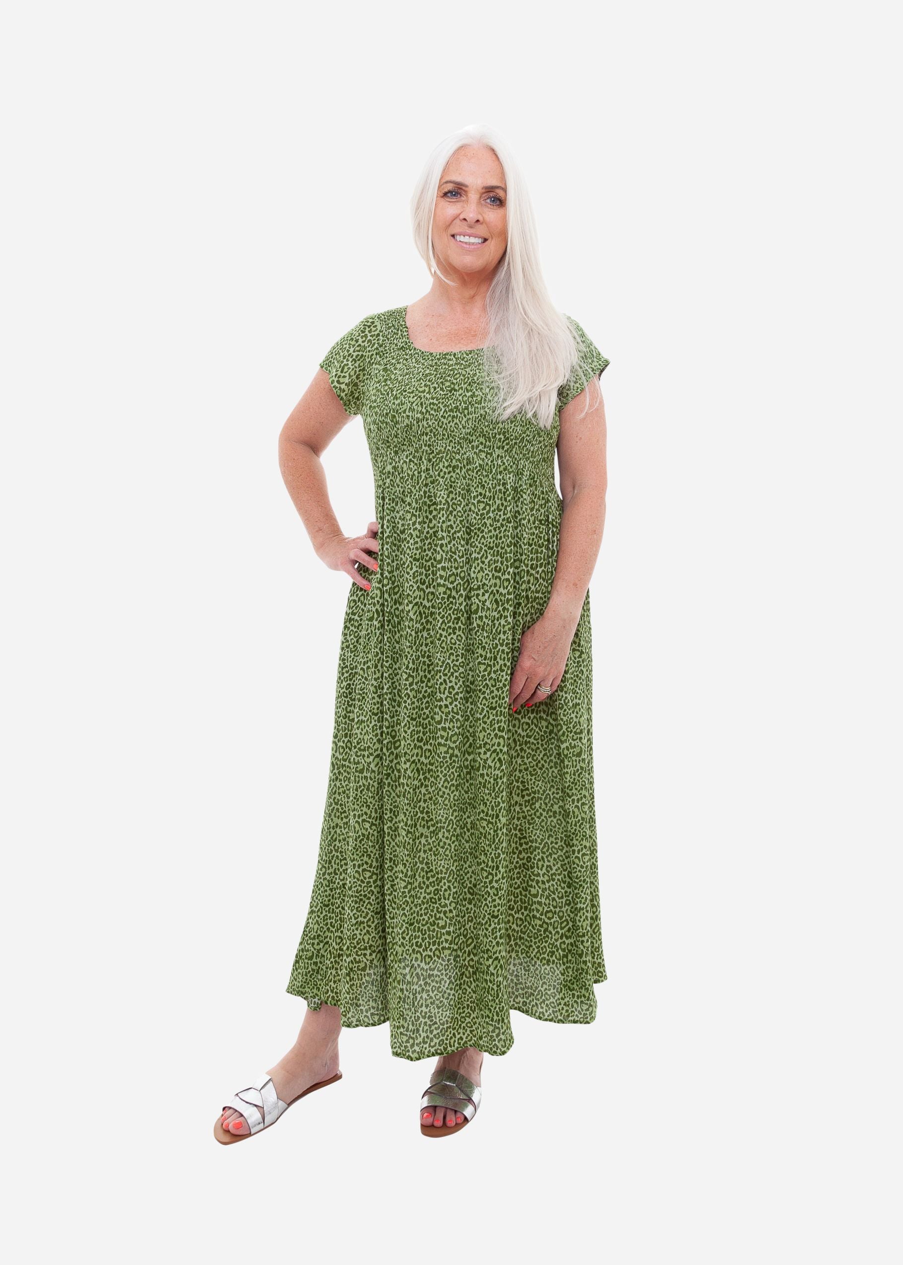 This playful tonal leopard dress in khaki is designed to flatter UK sizes 10-16 with its comfortable one-size fit. Made from 100% viscose, it offers a soft, breathable feel perfect for any occasion. The short sleeves and shirring detail add a fun, stylish touch to your wardrobe.
