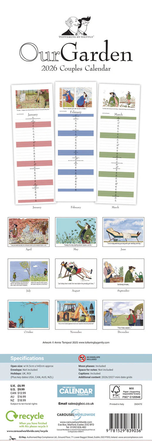 Stay on track with your garden plans and daily life in a fun, lighthearted way with the Tottering By Gently Our Garden Couples Planner Slim Calendar 2026. Designed for gardening pairs, this slim calendar blends charming illustrations with practical planning space, helping you juggle tasks, appointments, and those all-important garden moments together throughout the year. Perfect for couples who love a little whimsy while keeping organized side by side.