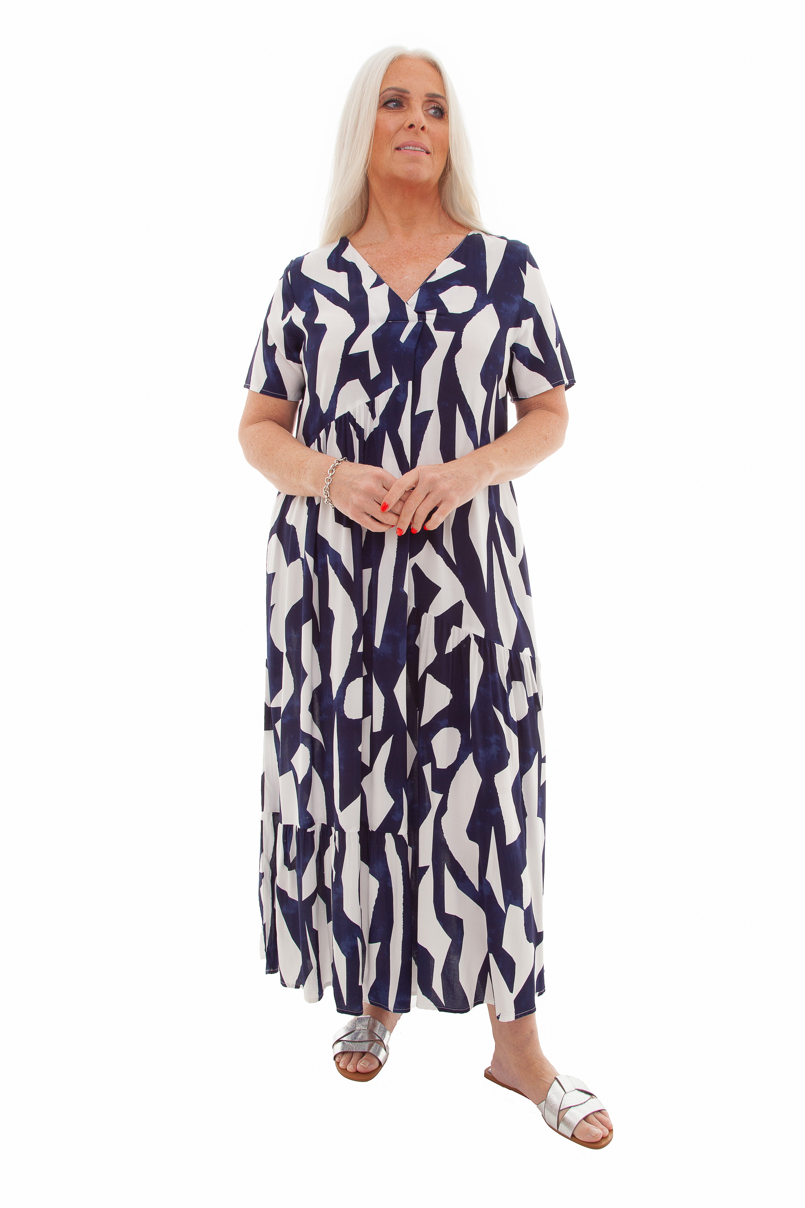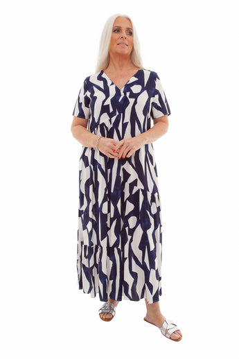 Dreams - Viscose Marble Geo Assymmetric Tiered Dress - Navy