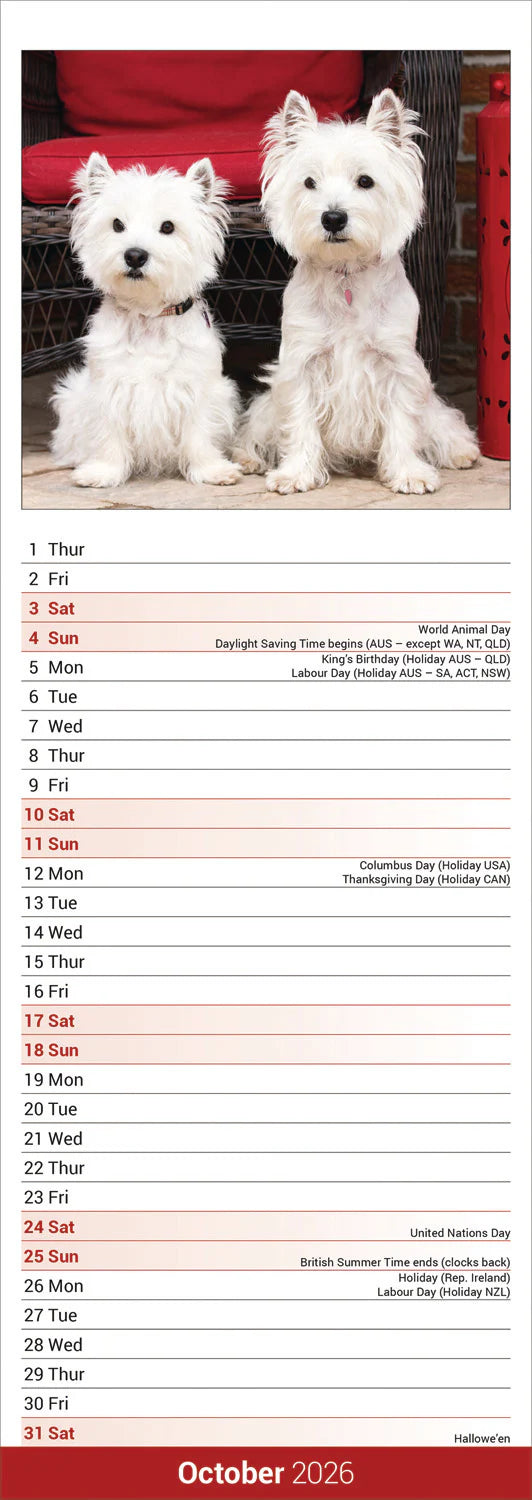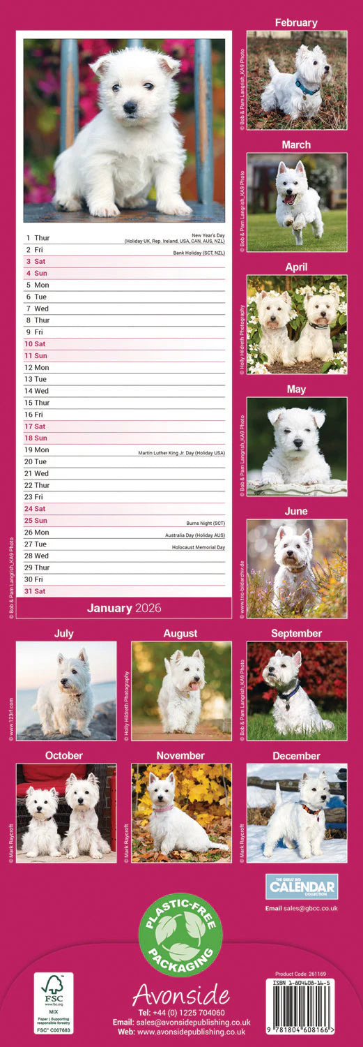 Celebrate every month of 2026 with the charming West Highland White Terrier! This slim calendar fits perfectly in any space, bringing playful energy and the irresistible cuteness of Westies to your year. Keep track of your days with a wagging tail and bright smiles, making planning as delightful as a pup’s frolic.